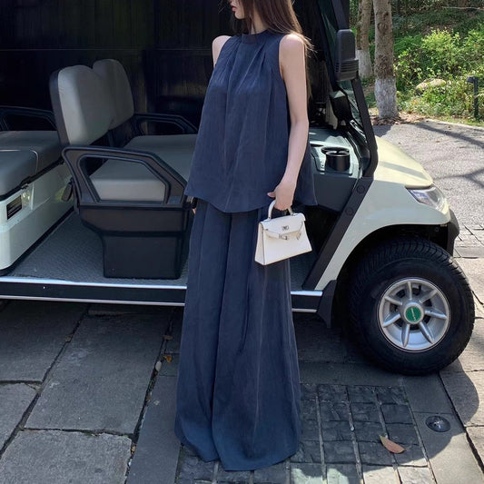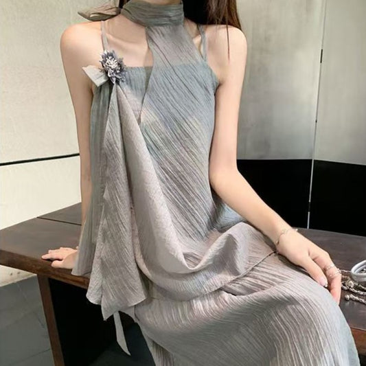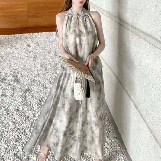 New Chinese Style Tie-Dye Halter Neck Top And Long Skirt Two-Piece Set