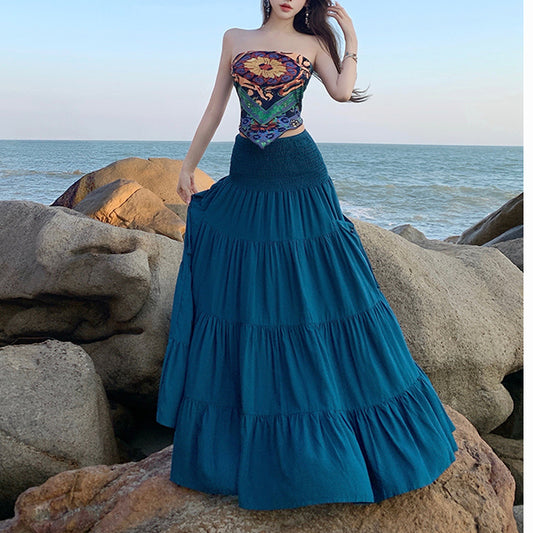 New Chinese Style Tie-Dye Halter Neck Top And Long Skirt Two-Piece Set