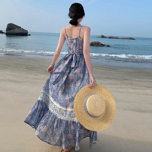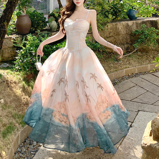 French-Style Tie-Dye Vacation Print Spaghetti Strap Dress
