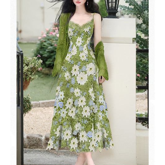 Green Cardigan And Hollow-Out Strap Dress Two-Piece Set