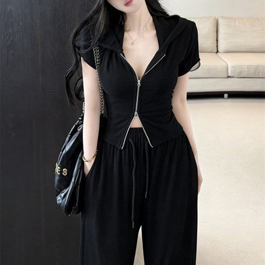 Casual And Stylish Hooded Double-Zip Short-Sleeved T-Shirt And Loose Wide-Leg Trousers Set