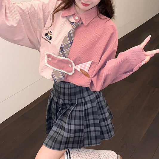 Retro Embroidered Corduroy Color-Blocked Tie Shirt