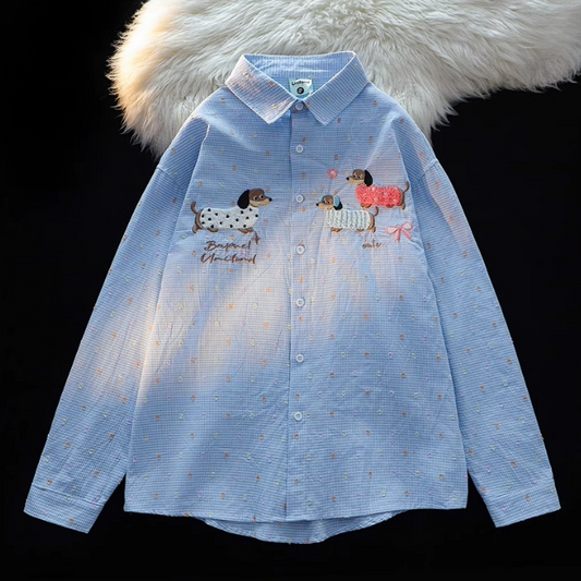 Cute Dachshund Embroidered Long-Sleeved Shirt
