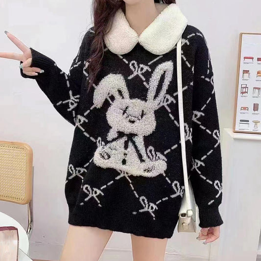 Rabbit Fur Collar Long Sleeve Knit Loose Sweater