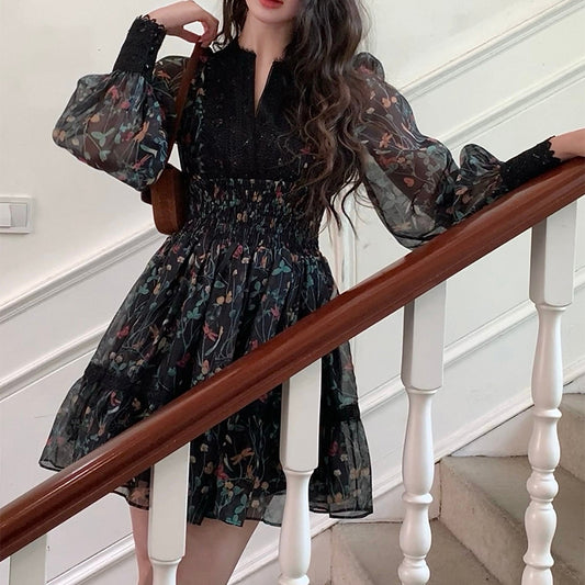 Retro Floral Print Lace Waist-Cinching Dress