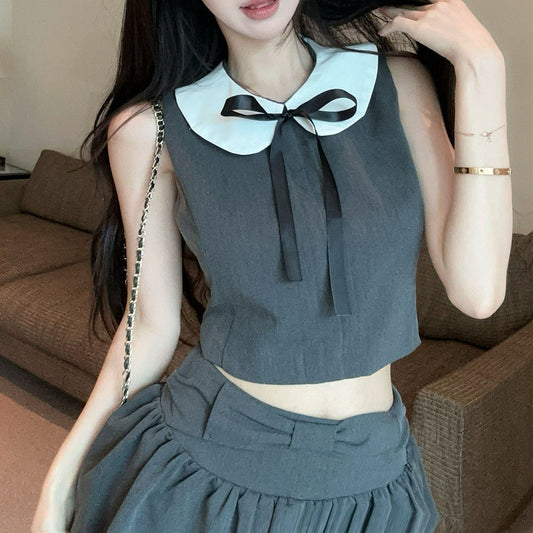 Preppy Style Color-Blocked Off-Shoulder Sleeveless Vest And Skirt Set