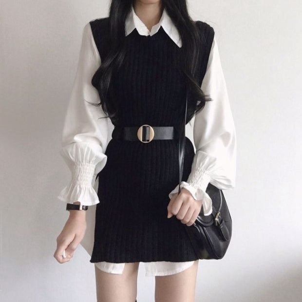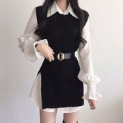Flared Sleeve Shirt Belt Knitted Vest Winter Dress Set
