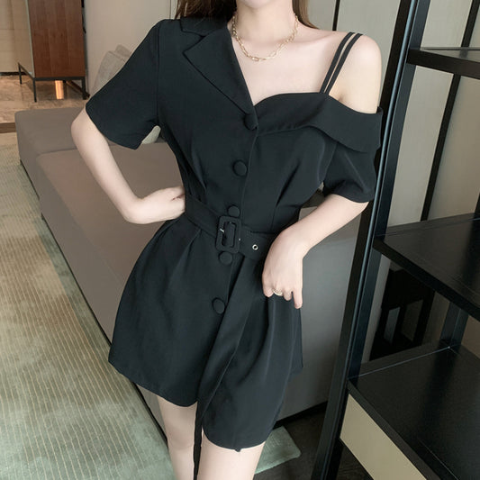 One-Shoulder Belt Waist Short-Sleeved Suit Dress