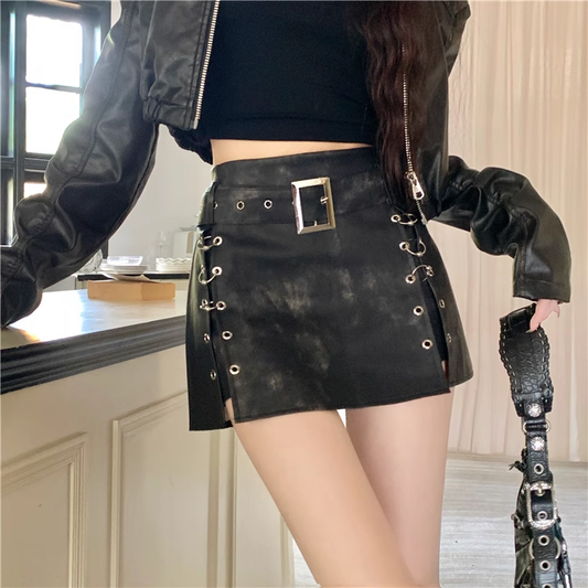 Metal Ring High Waist Belt A-Line Leather Skirt