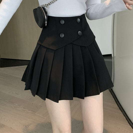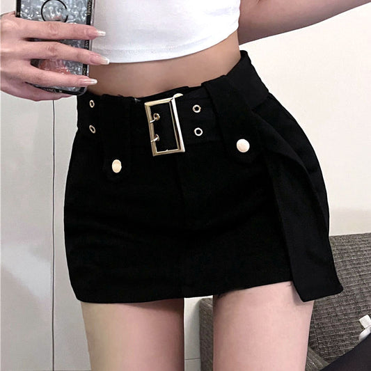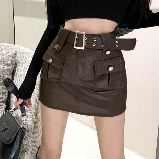 Metal Buckle Belt High Waist Pocket A-Line Leather Skirt