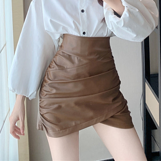 Folded Irregular High Waist A-Line Short Leather Skirt