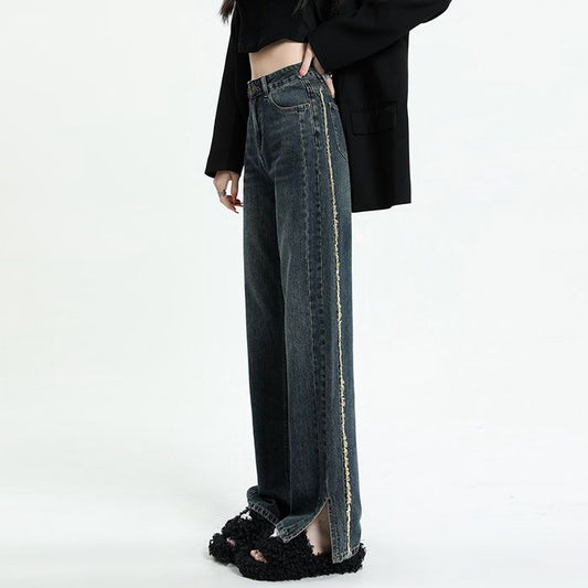 High Waist Jeans Slit Raw Edge Wide Leg Pants