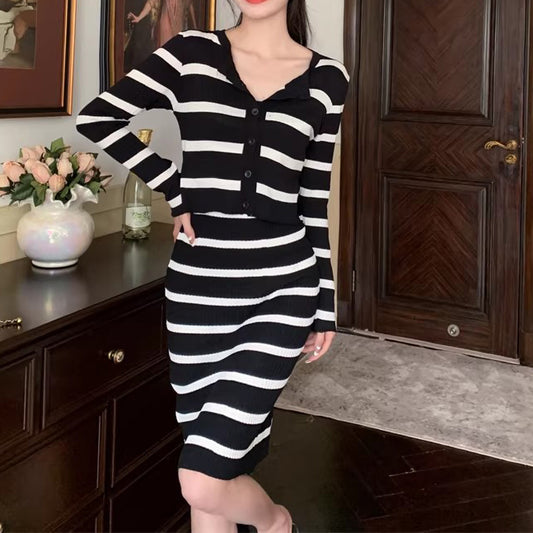 Striped Contrast Cami Dress Knit Cardigan Top Winter Set