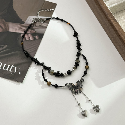 Double-Layer Gravel Love Butterfly Tassel Necklace
