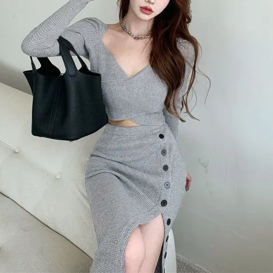 Long-Sleeved V-Neck Sweater High-Waisted Skirt Set