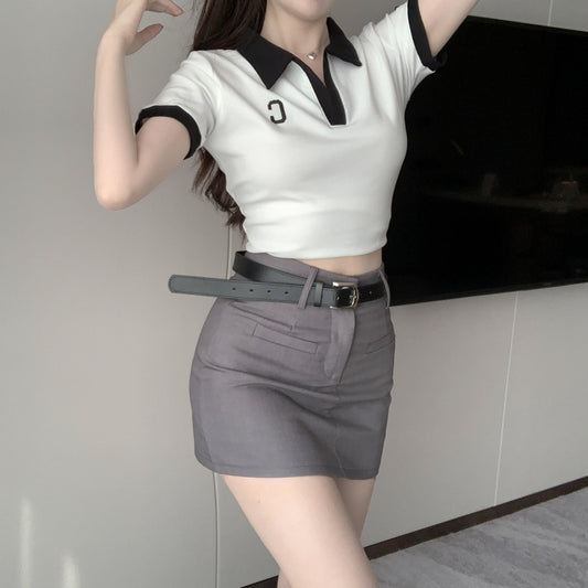 French Sexy Contrast Color Fake Two-Piece Sweatshirt High Waist Skirt Two-Piece Set