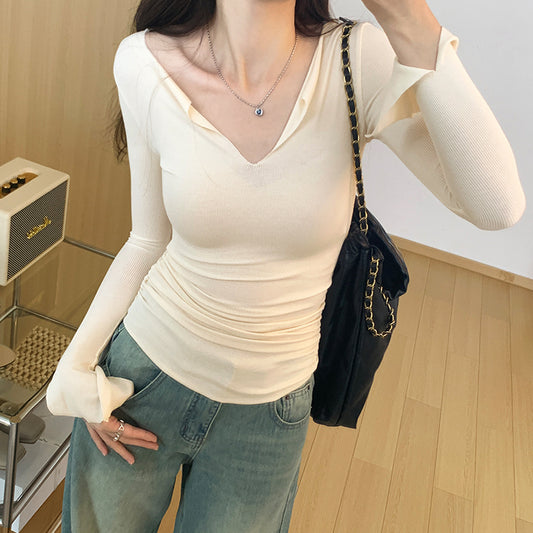 Buttoned Lapel Long Sleeve Slim Fit T-Shirt Top