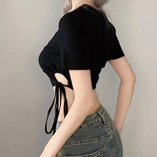 Shoulder Pad Short-Sleeved T-Shirt Backless Hollow Top