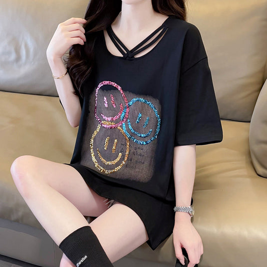 Hollow V-Neck Loose Colorful Smiley Face T-Shirt