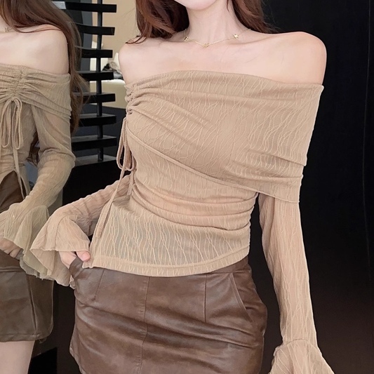 Off-Shoulder Hollow Lace Patchwork Trumpet Sleeve Top T-Shirt