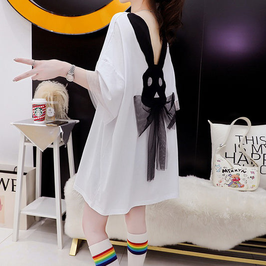Cartoon Print Backless Bow Round Neck Short-Sleeved T-Shirt