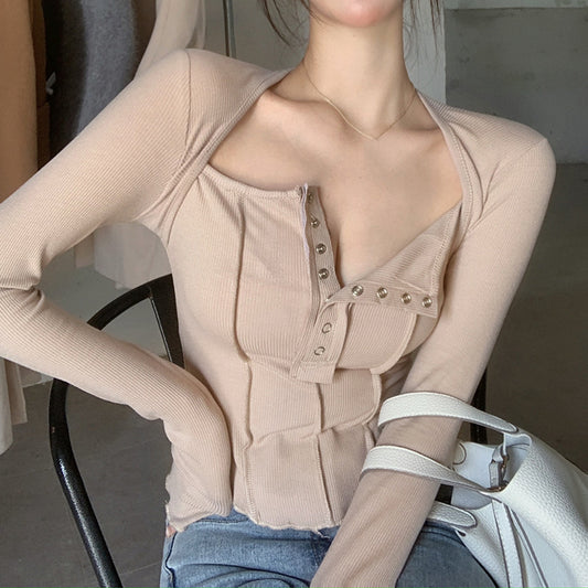 Single-Breasted Fashionable Sexy Chic Long-Sleeved Tie T-Shirt