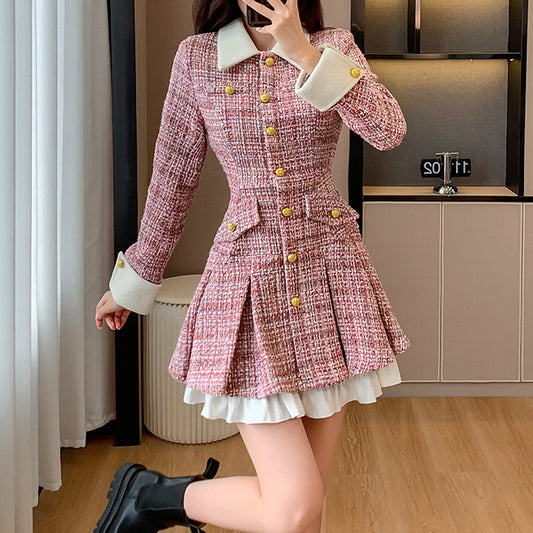 Doll Collar Chiffon Stitching Apricot Woolen Dress