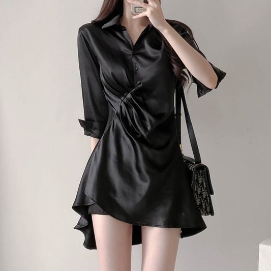 Solid Color Silk Polo Collar Shirt Dress