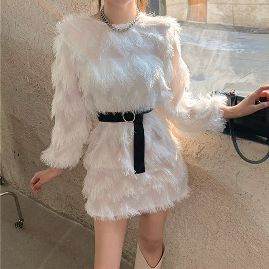 Fringe Long Sleeve Dress With Round Neck And Belt