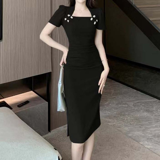 Retro Solid Color Cheongsam Square Neck Wrap Hip Dress