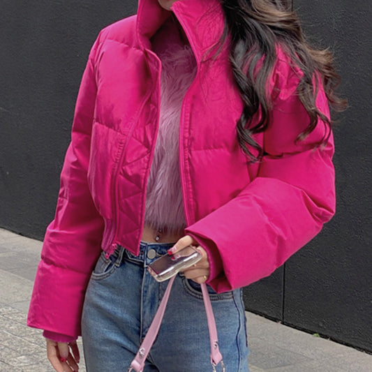 Rose Red Stand-Collar Short Cotton-Padded Coat