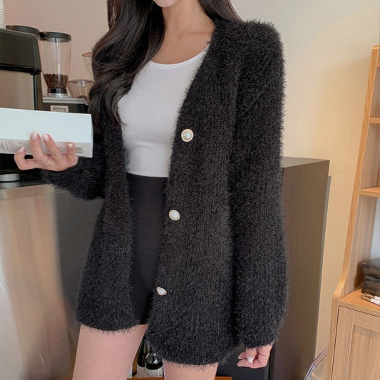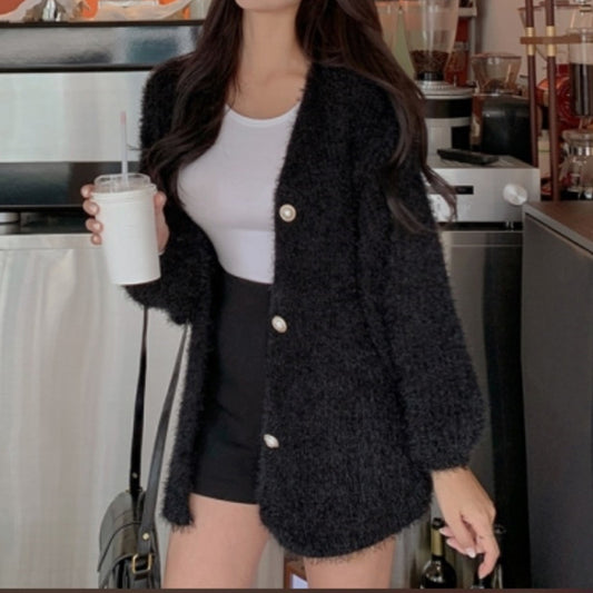 Single-Breasted Pearl-Button Cardigan Sweater Winter Coat