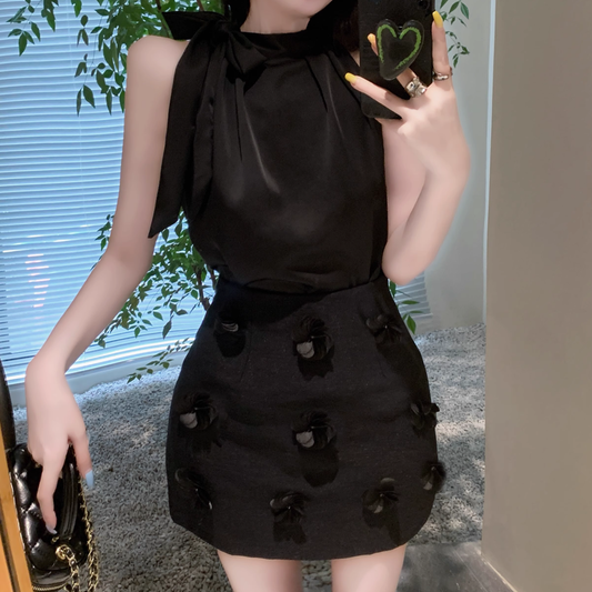 Sleeveless Off-Shoulder Tie Top Flower Skirt Set
