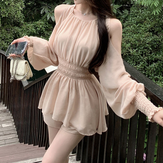 Off-Shoulder Chiffon Top Elastic Waist Shorts Set