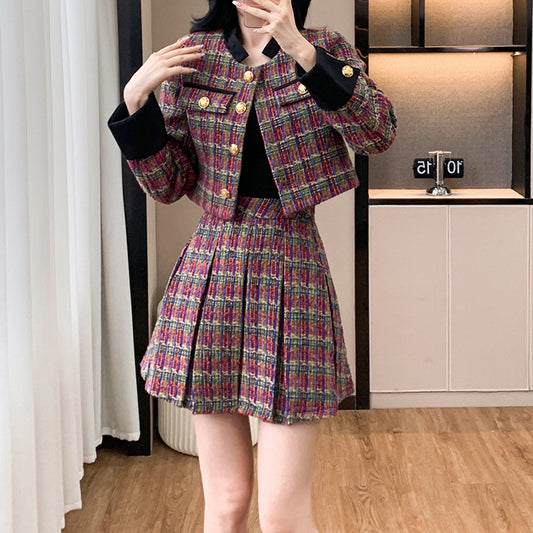 Tweed Buttoned Plaid Jacket Elegant Pleated Skirt Set