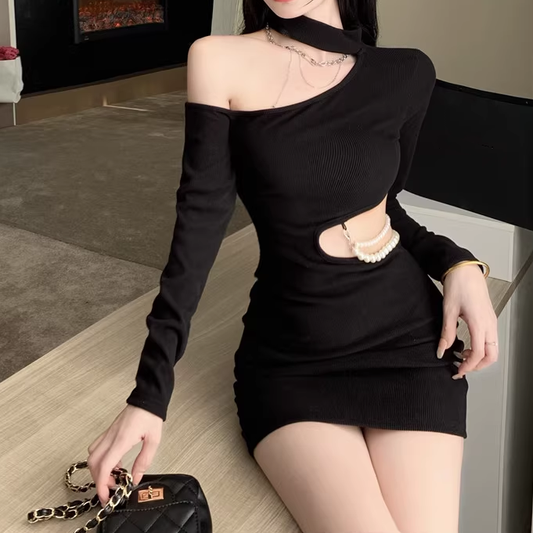 French Style Waist-Baring Off-Shoulder Slit Dress