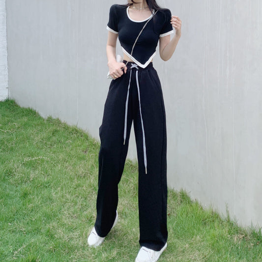 Irregular Short Sleeve T-Shirt High Waist Tie Pants Suit