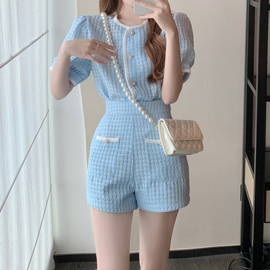 Short-Sleeved Suit Collar Waist Dress Shorts Set