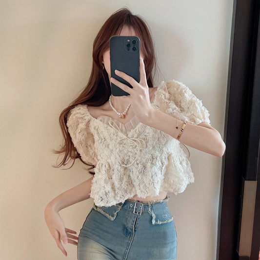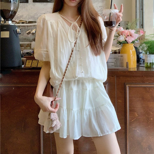 Summer Lace V-neck Bubble Short Sleeve Shirt