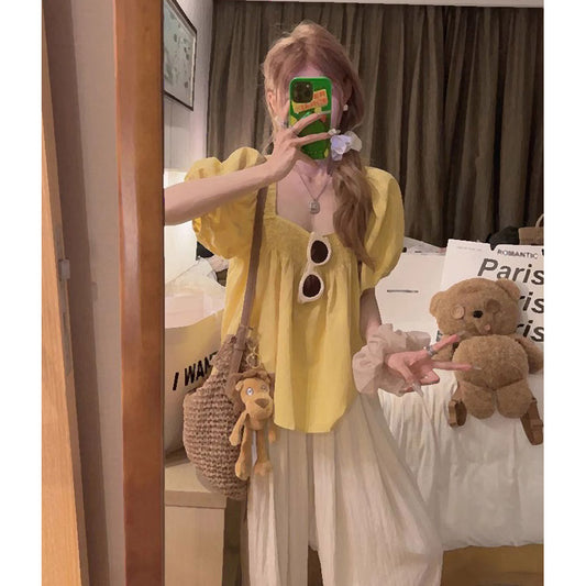 Summer Loose Square Neck Short Sleeve Two Piece Suit