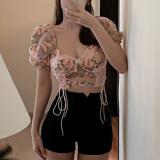 Sexy Mesh Lace Hook Flower Drawstring Short Pink Blouse