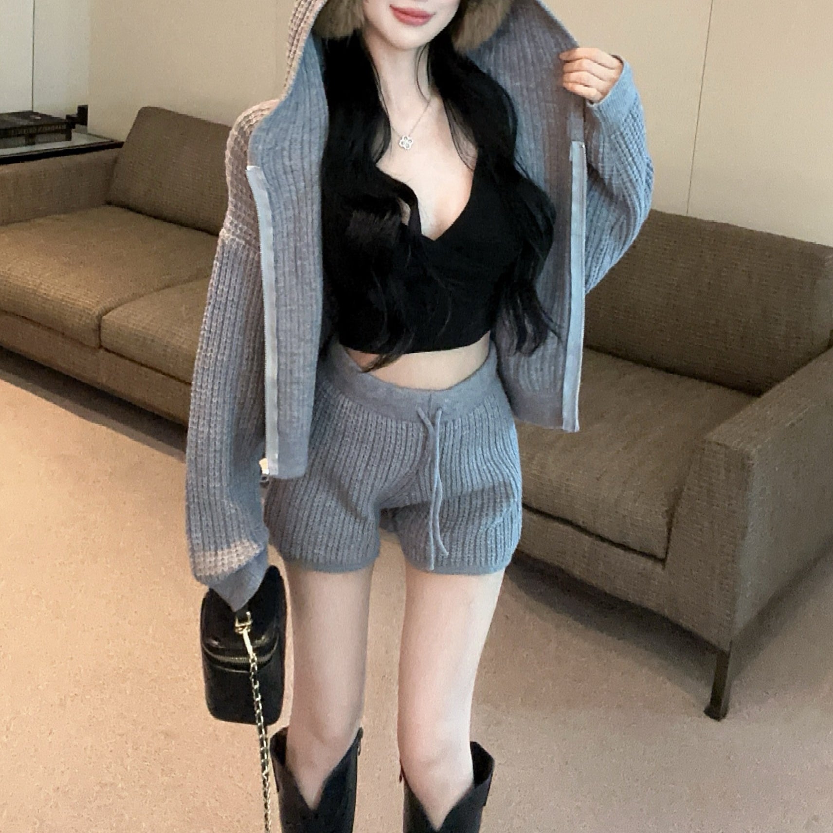Casual Fashion Hooded Loose Long Sleeve Knitted Cardigan Sweater Drawstring Shorts Two-Piece Set
