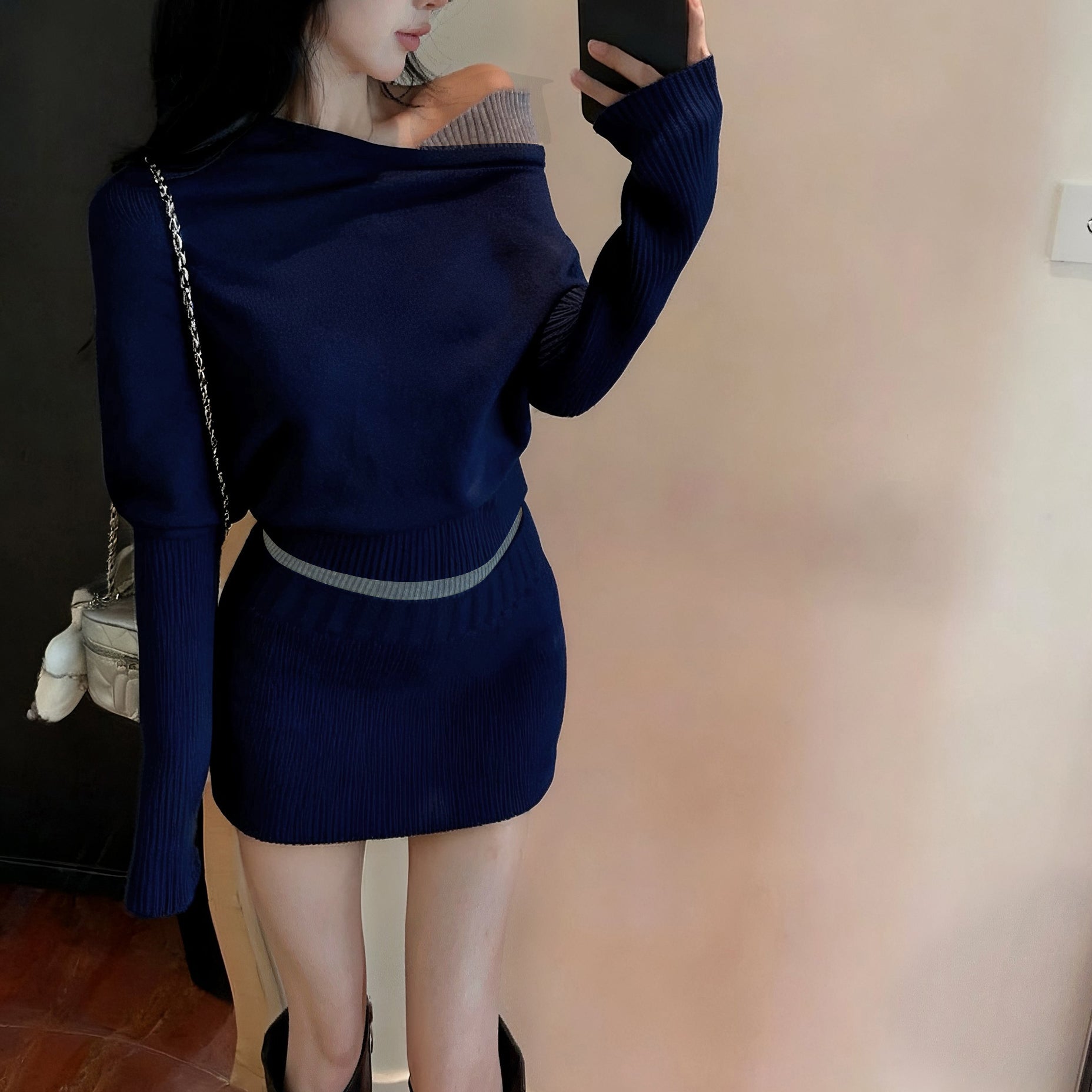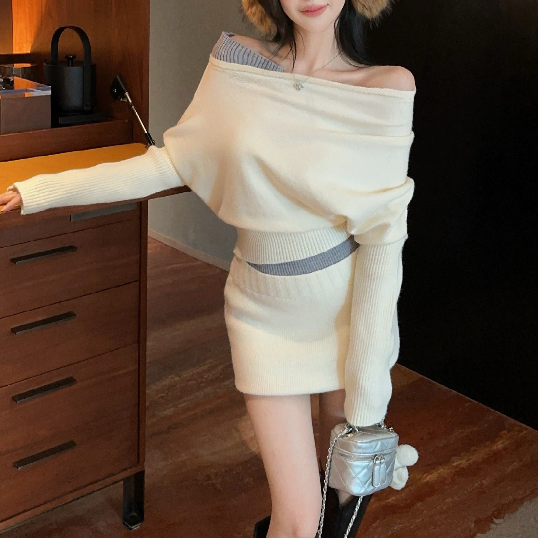 Fake Two-Piece Sexy Contrast Color Off-Shoulder Knitted Sweater Skirt Set