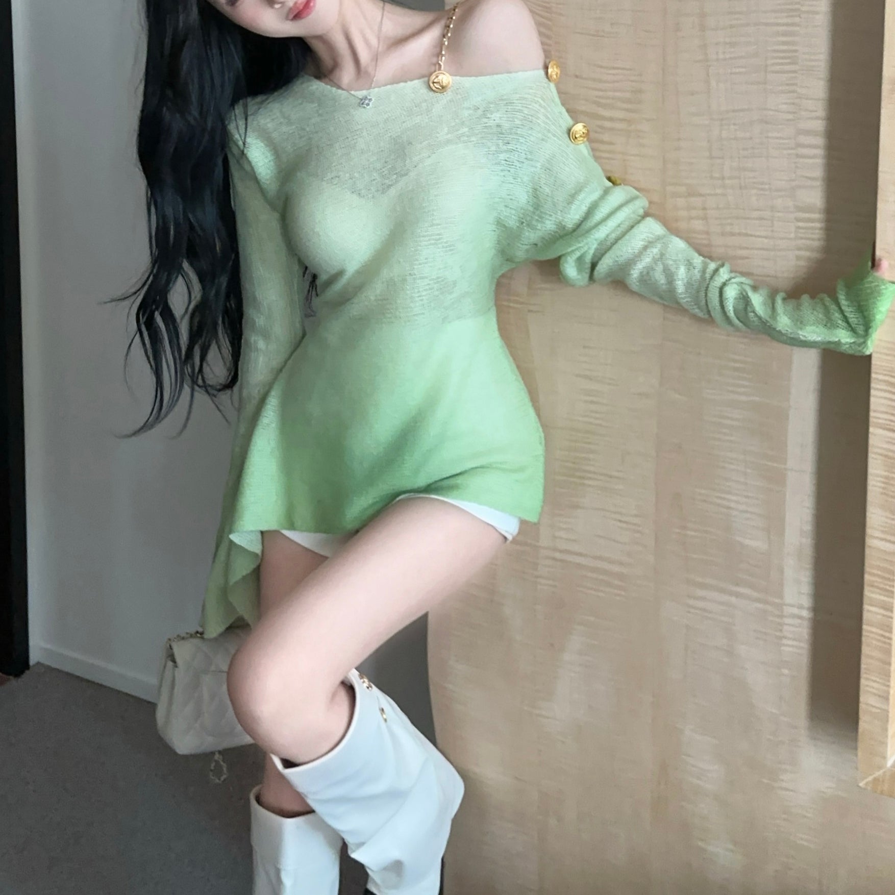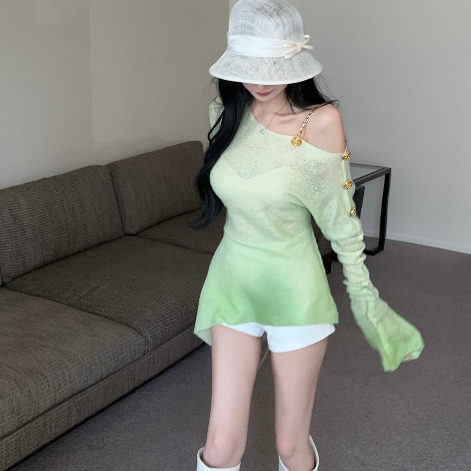 Gradient Color Off-Shoulder Metal Button Sexy Irregular Long-Sleeved Blouse