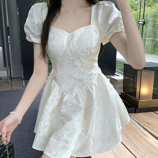 Square Neck Clavicle Slim Fit Puff Sleeve Short Dress
