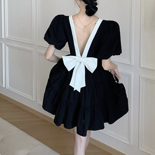 Backless Bow Square Neck Sweet Black Dress