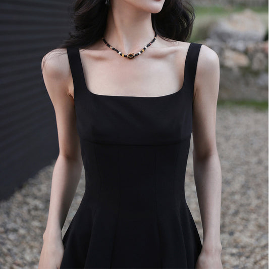 Sleeveless Square Neck High Waisted Black Dress