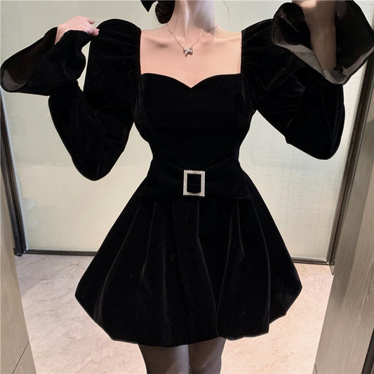 Trumpet Sleeve Velvet Square Neck Waist Black Dress