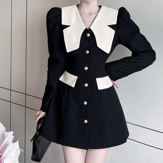 Color Block Long Sleeve Breasted Suit Dress