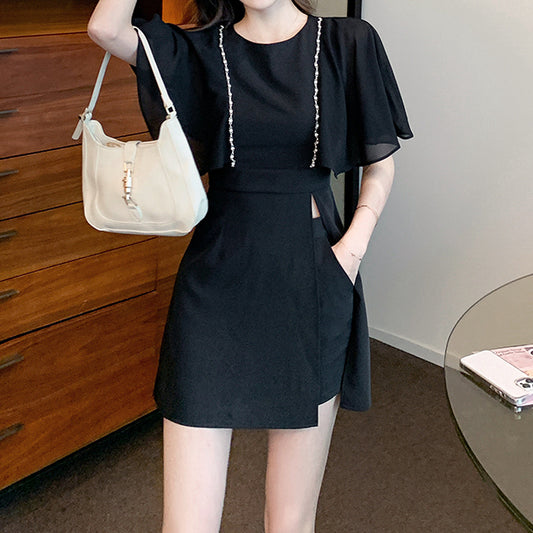 Bat Sleeve Slim Fit Black Dress Shorts Set